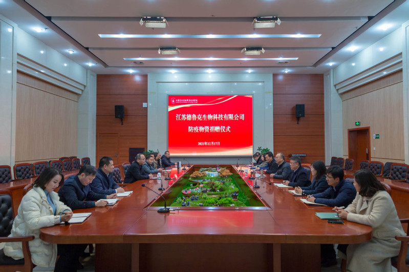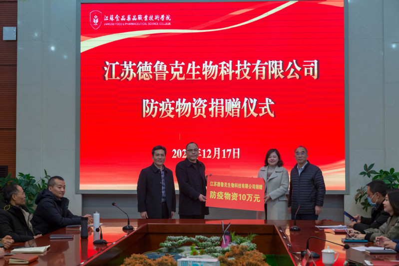 12月17日下午,江苏德鲁克生物科技有限公司副总经理戴恩峰代表董事长、总经理徐荣向我校再次捐赠10万元防疫物资。我校党委书记陶书中、党委委员、组织部长周耀明出席捐赠仪式。